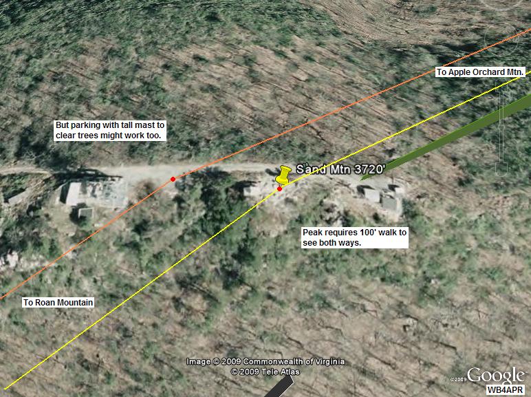 Sand Mountain is ideally located SE of Wythville in a location that has a rare view between mountains back to Roan mountain with no obstructions and also has a view to the Northeast to Apple Orchard Mountain. It is a non public site but is a sharp peak with several commercial and government relay buildings. The aerial view below suggests there is room for a car or two at the top. So far, access is unknown.